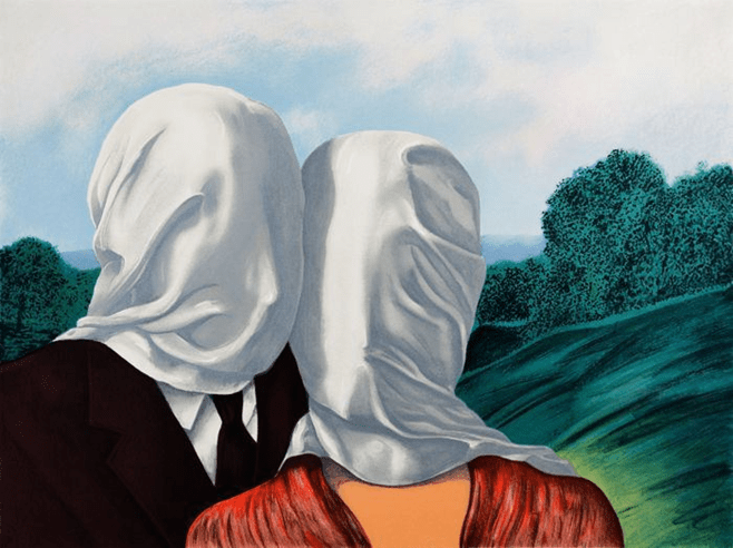 Karen: I’ve always loved these Magritte paintings ‘The Lovers’. Following on from what Michael and I have said about the questions a piece of art can throw up (all the ‘what ifs’), try working with the two images below: